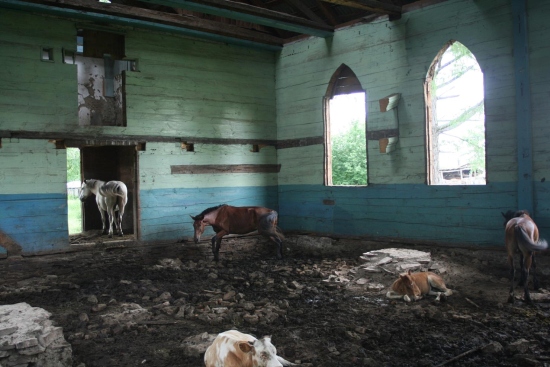 Alam-Bulanka külaelu – kariloomad otsivad palava päikese eest varju mahajäetud pühakojas.