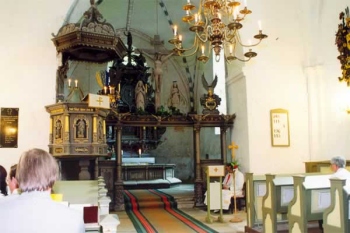 Kiriku sisevaade. Kivist altarilauas on säilinud piiskopi poolt pühitsemisel sissekraabitud viis pühitsusristi. Kolmeosaline figuuride poolest rikkalik altarisein toob esile lunastusloo kolm keskset sündmust. Arhiiv