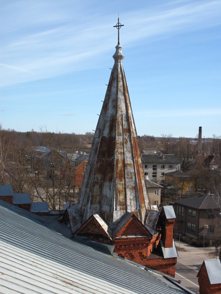 1884. aastal pühitsetud neogooti stiilis punastest tellistest kirik sai torni paarkümmend aastat hiljem, 1903. aastal. Torni teraskonstruktsioonid toodi kohale Putilovi tehastest. 2011. aastal saab uhke torni ja tornikestega pühakoda peale uhiuue tsinkplekk-katuse.