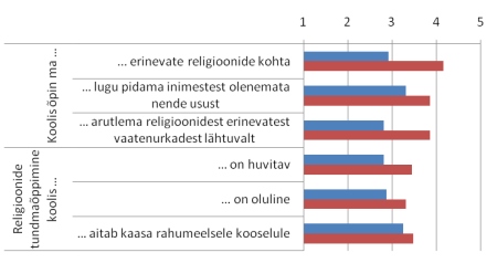 Usundiõpetust õppinud (punane) ja mitteõppinud (sinine) õpilaste suhtumine koolis antavasse religioonialasesse haridusse uuringu andmetel, mida on toetanud Euroopa Liit läbi Euroopa Regionaalarengu Fondi (REDCo, 2008). 5 – täiesti nõus, 4 – nõus, 3 – pole nõus ega vastu, 2 – pole nõus, 1 – pole üldse nõus.