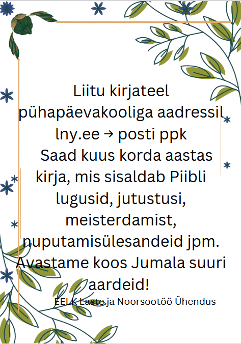 Vanusepiirangut ei ole ja koguduslik kuuluvus ei määratle ka osalemist. Ettevõtmisega saab liituda lingi abil: https://forms.gle/tcXvAKbnJMYvPBUt9 ning LNÜ kodulehelt lny.ee -> posti ppk. Pühapäevakooli kirju saadetakse orienteeruvalt kuus korda aastas kas kirja teel postiga või veebi vahendusel meilile.