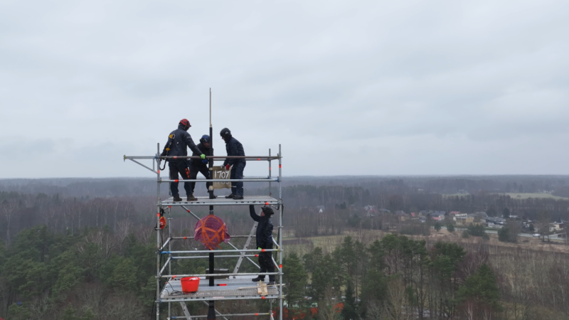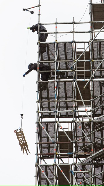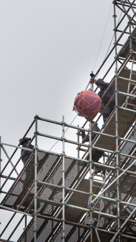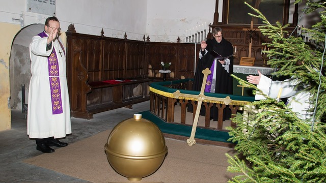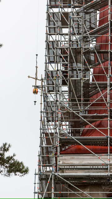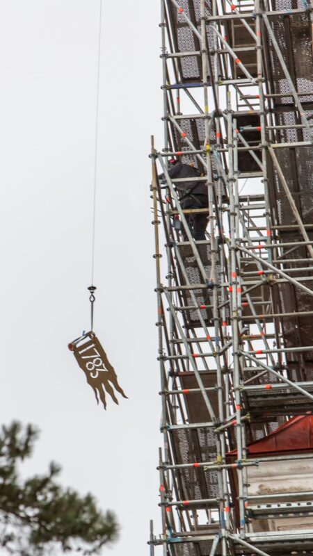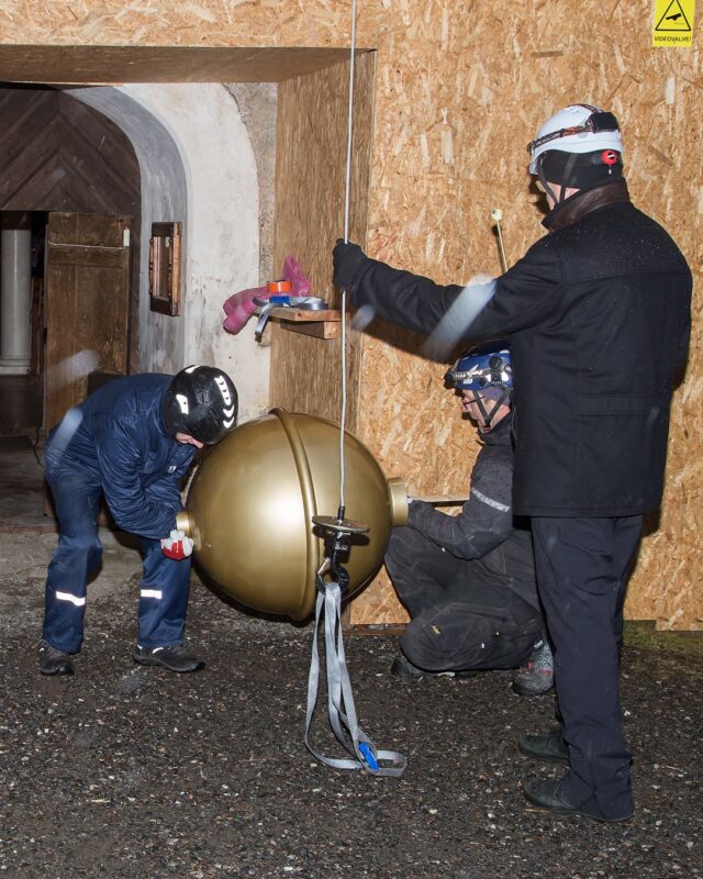 Pühitsemistalituse järel paigaldasid OÜ Rändmeister töömehed kuuli, tuulelipu ja risti pealtvaatajate silme all kohe ka kirikutorni.