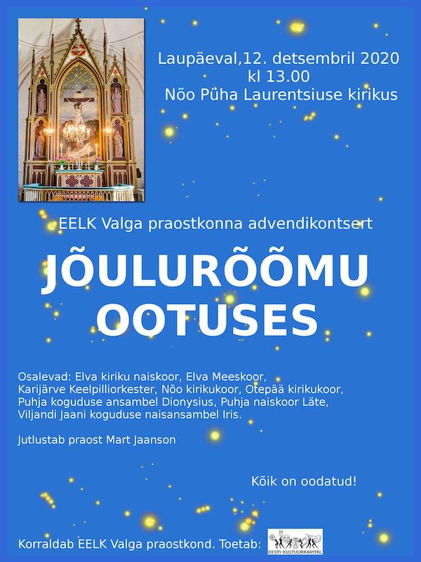 12. detsembril kl 13 on Nõo kirikus Valga praostkonna advendikontsert. Osalevad Valga ja Viljandi praostkonna kollektiivid. Jutlustab praost Mart Jaanson.