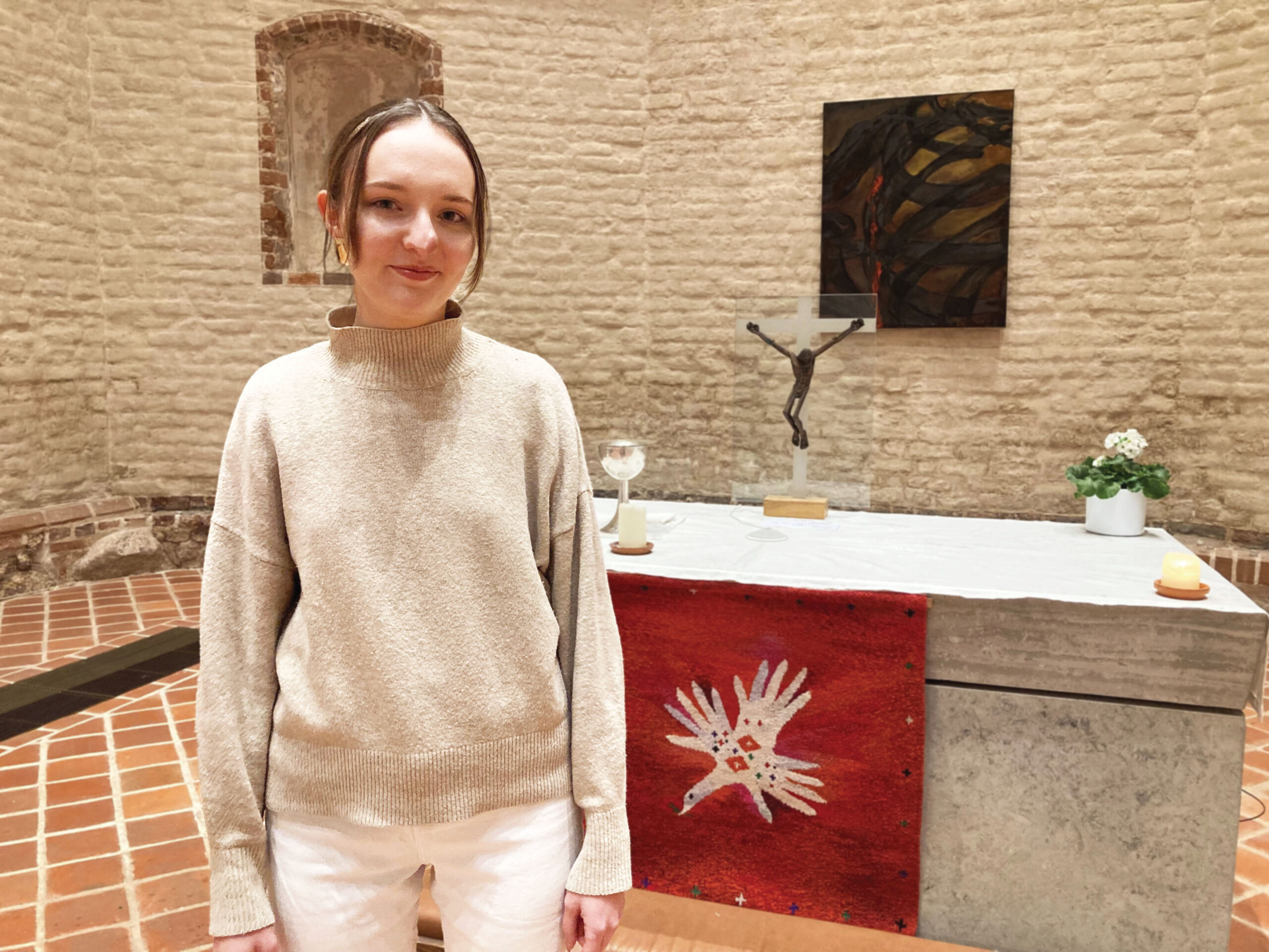 Tartu Jaani kiriku altari ees seisev Sippie Guth on alates vaiksest laupäevast kristlane. „Olen olnud selle sammu suunas teel juba pikka aega,“ tunnistab Eesti Kiriku reporter ise vahetult pärast Tartu Ülikooli-Jaani koguduse vaikse laupäeva hilisõhtust jumalateenistust, mil lisaks Sippiele ristiti veel viis leerilast. Sippie Guth on Eesti Kiriku ajakirjanik alates septembrist 2024 ning toona Tartu Ülikooli usuteaduskonna bakalaureuseõppes tudeerivast neiust on tänaseks saanud magistrant. Eesti Kiriku toimetus on väga rõõmus, et meie keskel on uus ristiinimene ja soovime noorele töökaaslasele hoitud elu Taevaisa käekõrval. Foto: Liina Raudvassar