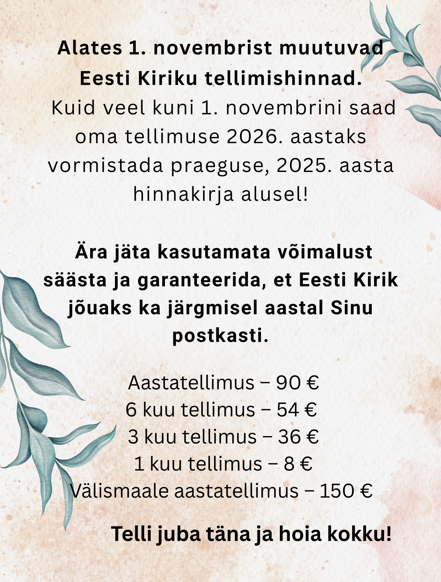Eesti Kiriku tellimishinnad muutuvad