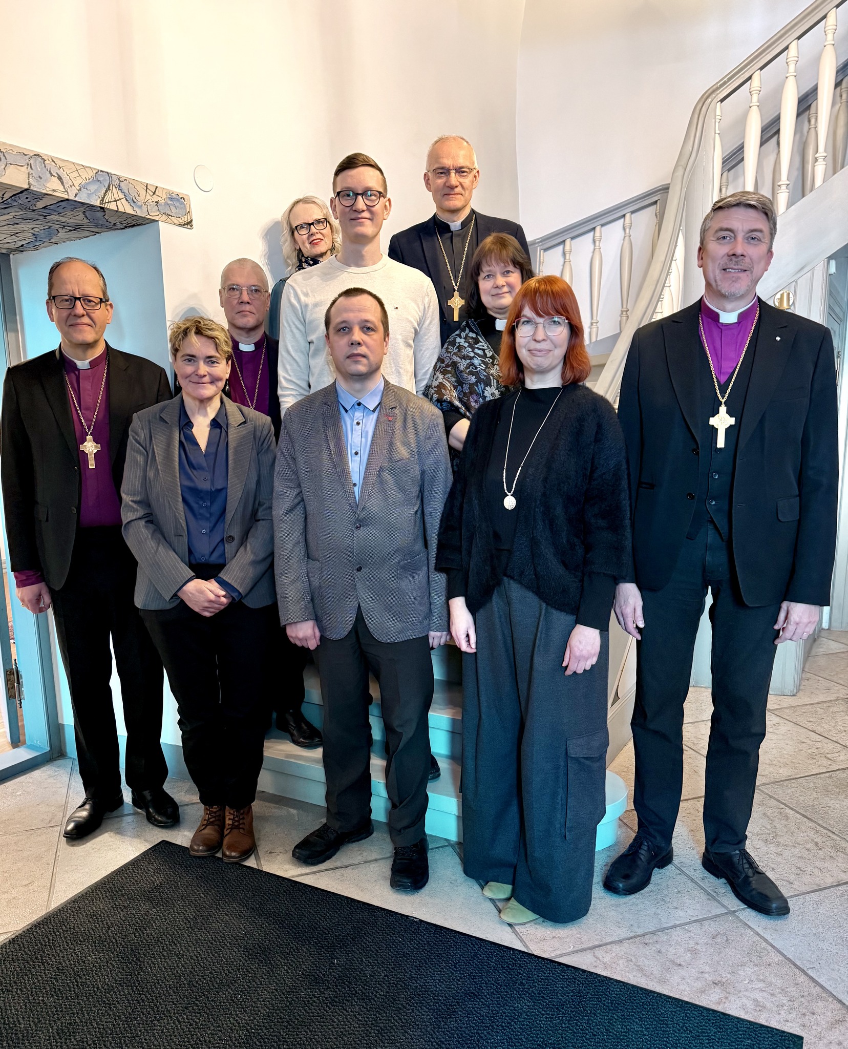 Pärast diakonieksamit on fotole jäädvustatud kirikuvalitsus ja diakoniameti kandidaadid: (1. rida paremalt) peapiiskop Urmas Viilma, Elina Kivinukk, Egert Nikolajevski, Bianca Mikovitš, piiskop Ove Sander; (2. rida paremalt) assessor Katrin-Helena Melder, assessor Mattias Haamer, piiskop ja pastoraalseminari juhataja Marko Tiitus, (3. rida paramalt) piiskop Anti Toplaan, pastoraalseminari juhataja assistent Liina Sander. Foto: peapiiskop Viilma pildiarhiiv