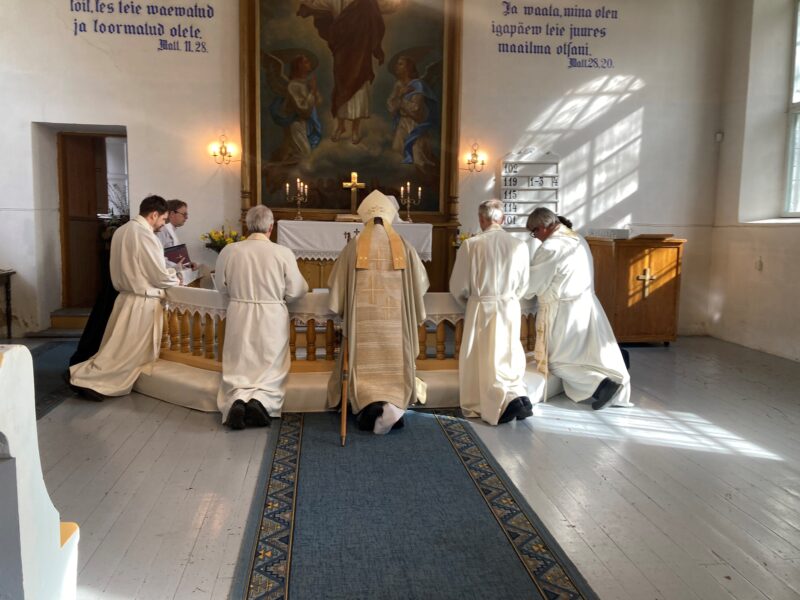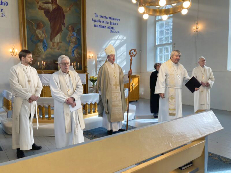 Lääne-Harju sinodipäeva avanud jumalateenistusel teenisid vaimulikest: pastor loci Aare Kimmel (paremalt), praost Jüri Vallsalu, õpetaja Lea Jants, peapiiskop Urmas Viilma, abipraost Mihkel Kukk ja Ariel Süvari. Foto: Liina Raudvassar