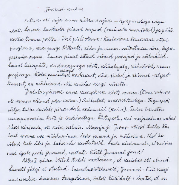 Aastate jooksul on nii toimetuse kui ka minu isiklikku arhiivi kogunenud hulgaliselt väärtuslikku materjali. Üks mahukas kaust fotodest, kirjutistest ja kirjadest on pühendatud Evald Saele. Seal leidub tema omakäeliselt kirja pandud mälestus jõuludest kodus Võrumaal. Veidi minevikumälestust kulub ka meile ära.