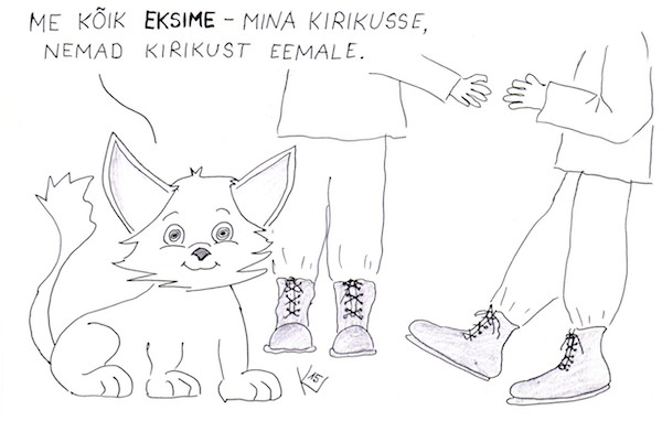 Kui Facebookis hakkas ringlema foto Viru-Jaakobi kirikus teenistuse ajal valget kiisut silitavast õpetajast Tarmo Linnasest, kerkis see loomad-kirikus-teema korraks nõks teravamalt üles, aga õnneks sinnapaika see ka jäi. Õnneks seepärast, et ma ausalt öeldes ei taha teada, kes veel minu ametivendadest või -õdedest võiks hiilata mõne viisin-kassi-metsa-stiilis sõnavõtuga, nagu selle armsa pildi alt järsku lugeda võis. Et mingi kass haises ja kräunus ning häiris?