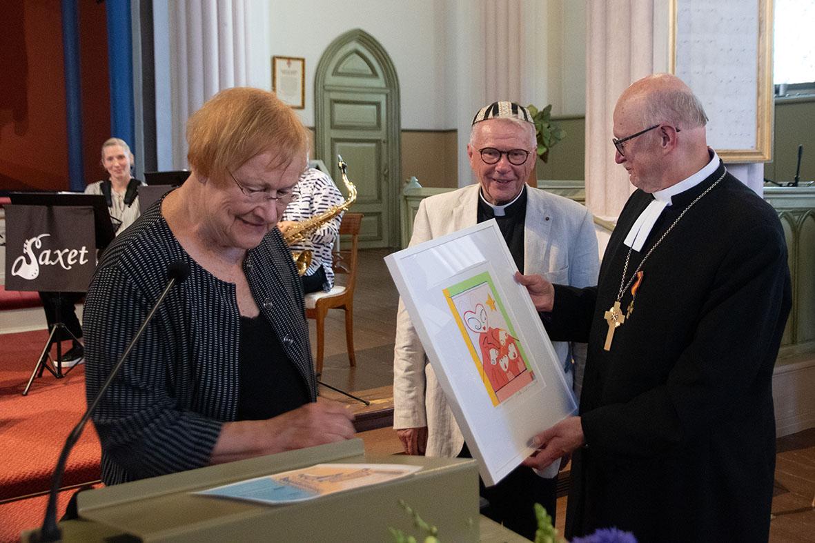 Loviisa rahupreemia andis piiskop emeeritus Tiit Salumäele (paremal) üle Soome endine president Tarja Halonen, keskel emeriitvaimulik Veli-Matti Hynninen. Foto: Seppo Sirkka
