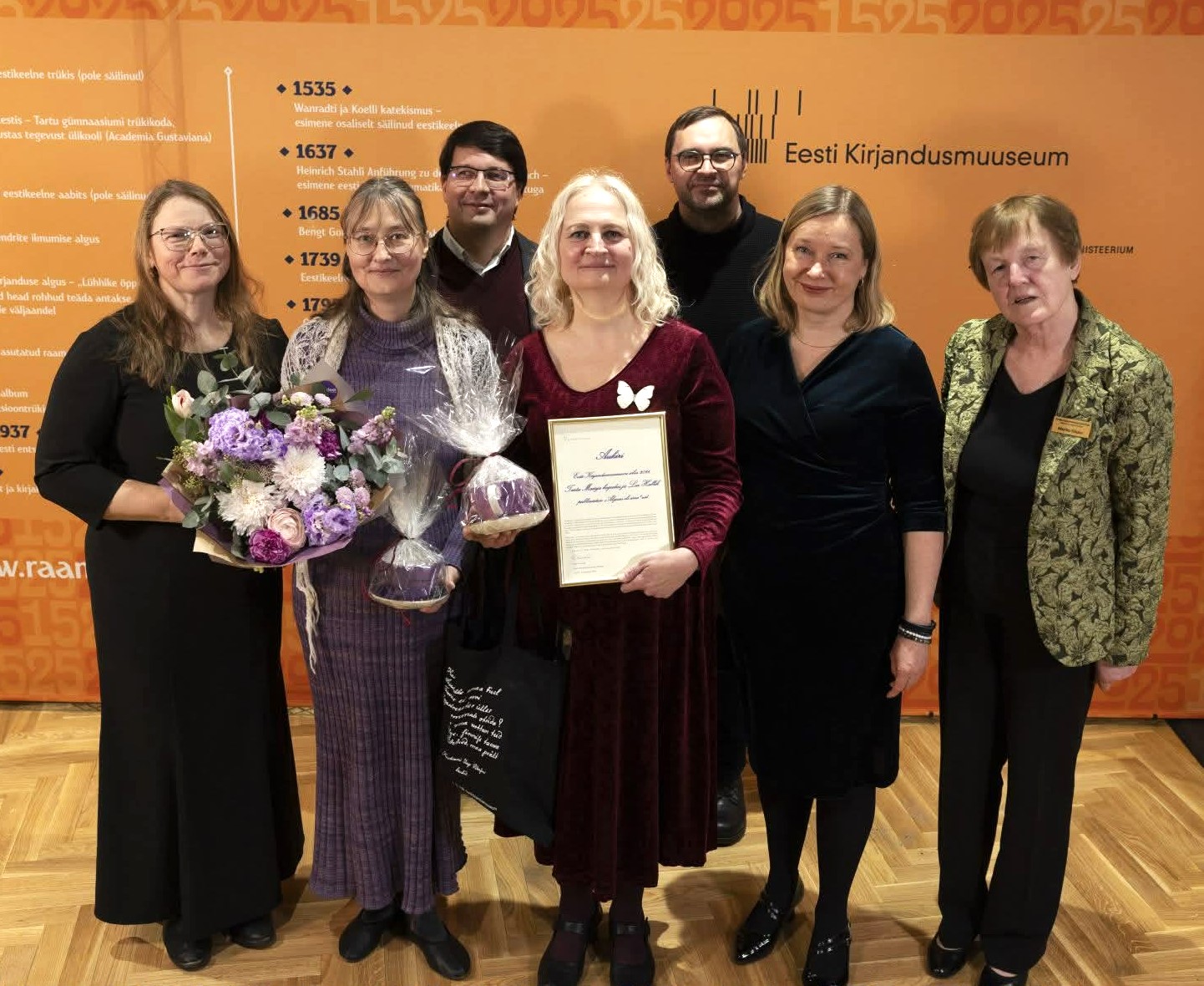 30. jaanuaril pälvis Tartu Maarja kogudus kirjandusmuuseumi sõbra tiitli. Fotol (vasakult) auhinna vastu võtnud Elo Kikas, Lea Hallik ja Maarja koguduse juhatuse esimees Helika Gustavson-Rätsep, kirjandusmuuseumi direktor Piret Voolaid, arhiivraamatukogu juhataja Merike Kiipus. Nende taga (vasakult) dr Urmas Nõmmik ja kirikuvanem Indrek Pekko. Foto: Alar Madisson