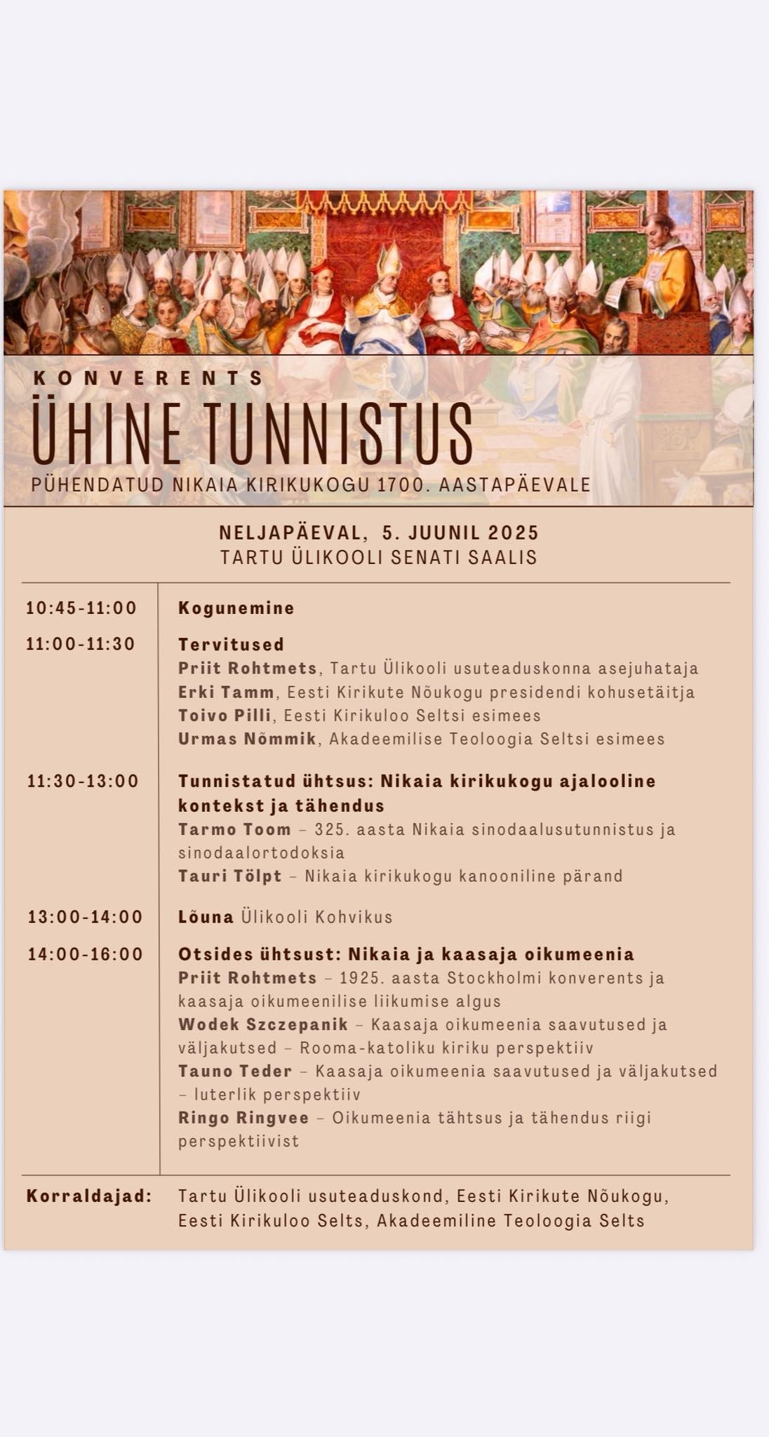 Kirikukogu aastapäeva tähistamiseks toimub Tartu Ülikoolis konverents „Ühine tunnistus“, mille eesmärk on käsitleda Nikaia kirikukogu olulisust nii kiriku ajaloo kui ka kirikute tänapäevaste ühtsuspüüdluste kontekstis. Konverents toimub 5. juunil Tartus Tartu Ülikooli Senati saalis (Ülikooli 18–204).
