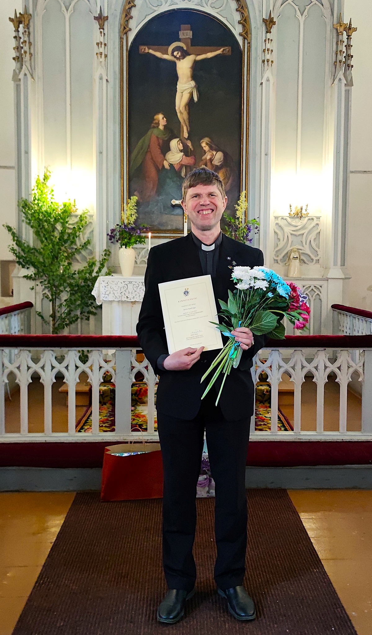 Õp Arvo Lasting Tarvastu koguduse altari ees koos piiskop Tiituse kinnituskirjaga, et ta on seatud Tarvastu koguduse hooldajaõpetajaks 14. juunil. Foto: Alar Karu