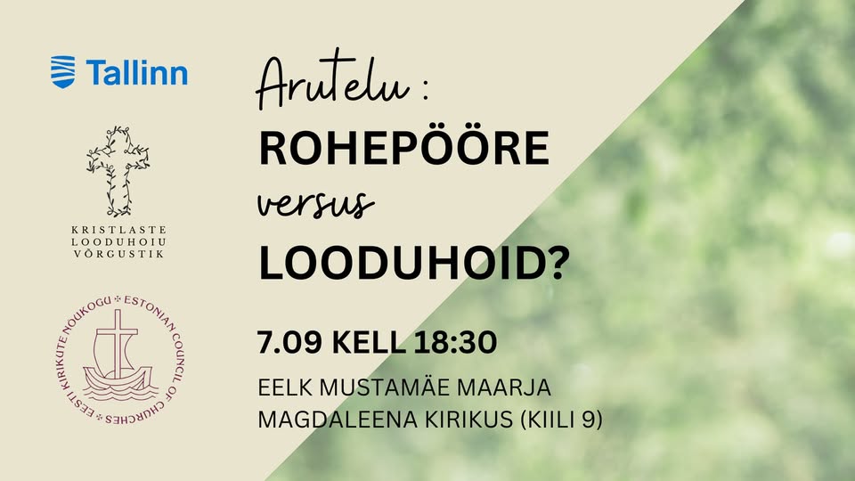 Enne arutelu toimub samas kohas kl 17 looduhoiukuu avateenistus – tule juba varem ja osale mõlemal! Vaata ülejäänud looduhoiukuu kava siit: https://ekn.ee/looduhoid.