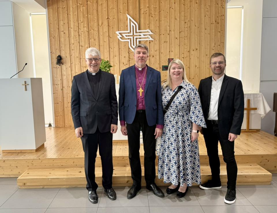 Eesti kogukond saab jumalateenistuste pidamiseks kasutada Soome luterliku kiriku ruume. Pärast teenistust on altari ette kogunenud (vasakult) Soome koguduse õpetaja Rolf Steffansson, peapiiskop Urmas Viilma, Egle Viilma ja soome koguduse organist Hannes Asikainen. Foto: peapiiskop Viilma arhiiv