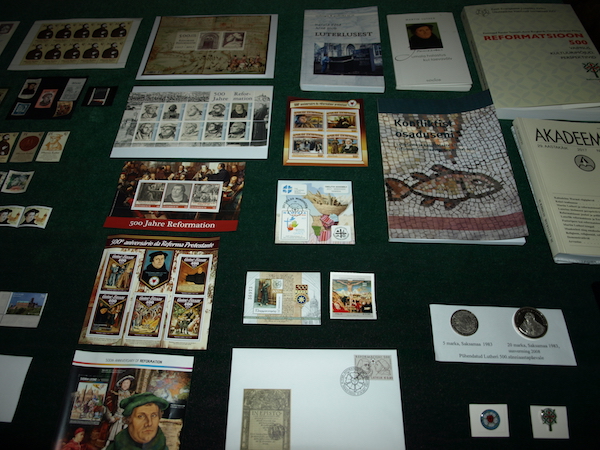 Kolmanda osa näitusest moodustavad meened, sh meenemündid, tervikasjad ja margid. Reformatsioonile pühendatud margiplokkide sarja tellis Anneli Lein Saksamaalt e-poest, kuid sai margiplokid kätte alles nädal aega tagasi. „Tellisin küll varakult, kuid „Reformatsioon 500“ osutus nii populaarseks, et mulle telliti see teema lausa eraldi ning nüüd olen koduleheküljelt vaadanud, et osa tooteid (margiplokid on Aafrikast, Ungarist, Liechtensteinist, Itaaliast, Saksamaalt) on juba otsas.“