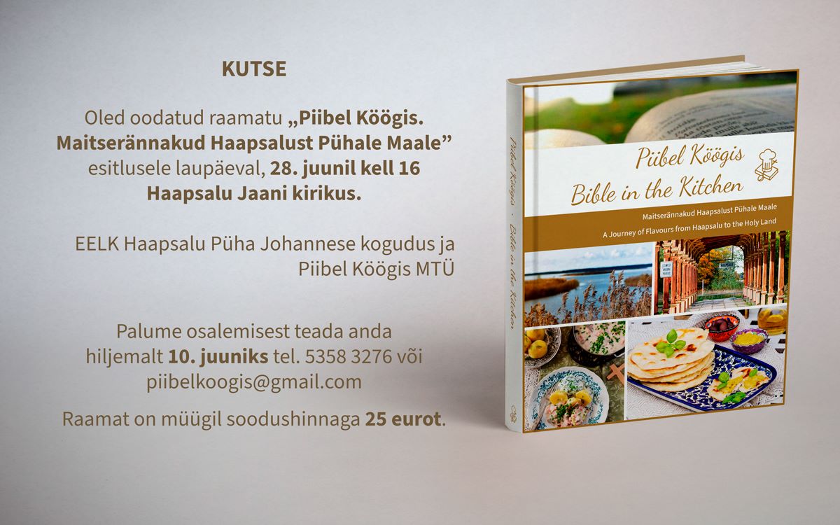Haapsalu Püha Johannese koguduse ja Piibel Köögis MTÜ koostööst sündinud kokaraamatu „Piibel Köögis. Maitserännakud Haapsalust Pühale Maale” esitlus toimub 28. juunil kl 16 Haapsalu Jaani kirikus.