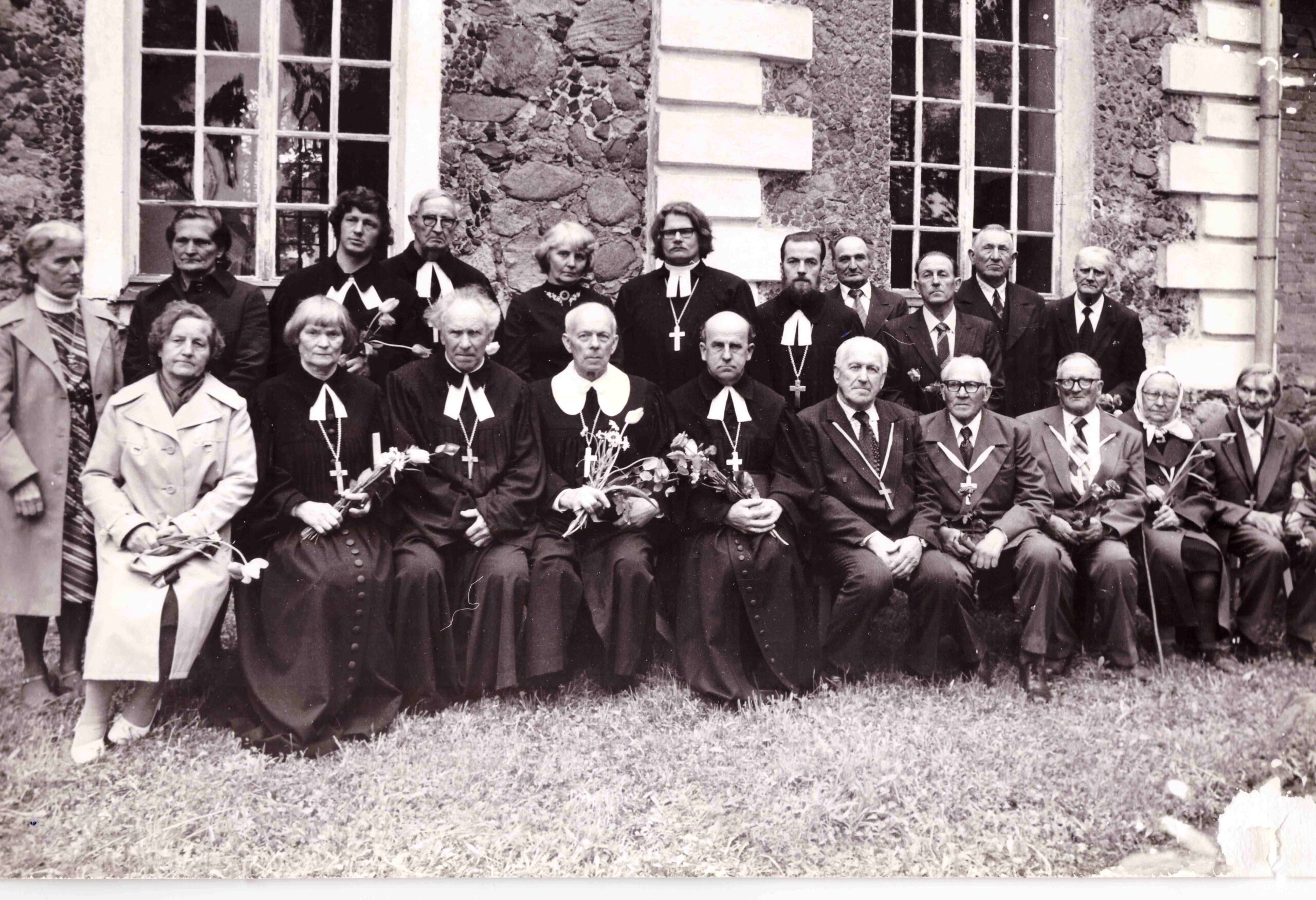 Vaimulikud ja vöörmündrid ning koguduse töötegijad kivikiriku 175. aastapäeva tähistamisel 1985. aastal Foto: Kanepi koguduse arhiiv