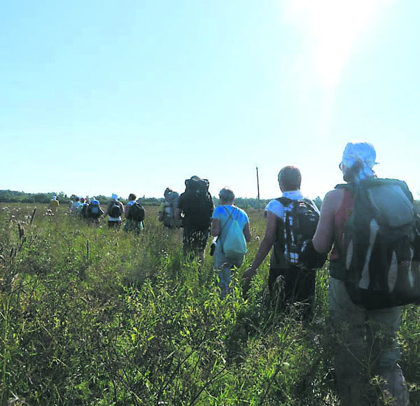 Esmalt viis tee otse üle heinamaa, läbi naatide ja nõgeste, lisaks ka üle ja läbi kraavi. Suurele teele jõudnutele näitas kollane nool õige suuna kätte ja rändurid jagunesid peatselt väiksemateks või suuremateks gruppideks või kõndisid päris üksi. Ilm tõotas tulla väga palav ja päikeseline – meile oli antud otsekui ekstra selle suve üks esimesi kuumemaid päevi.