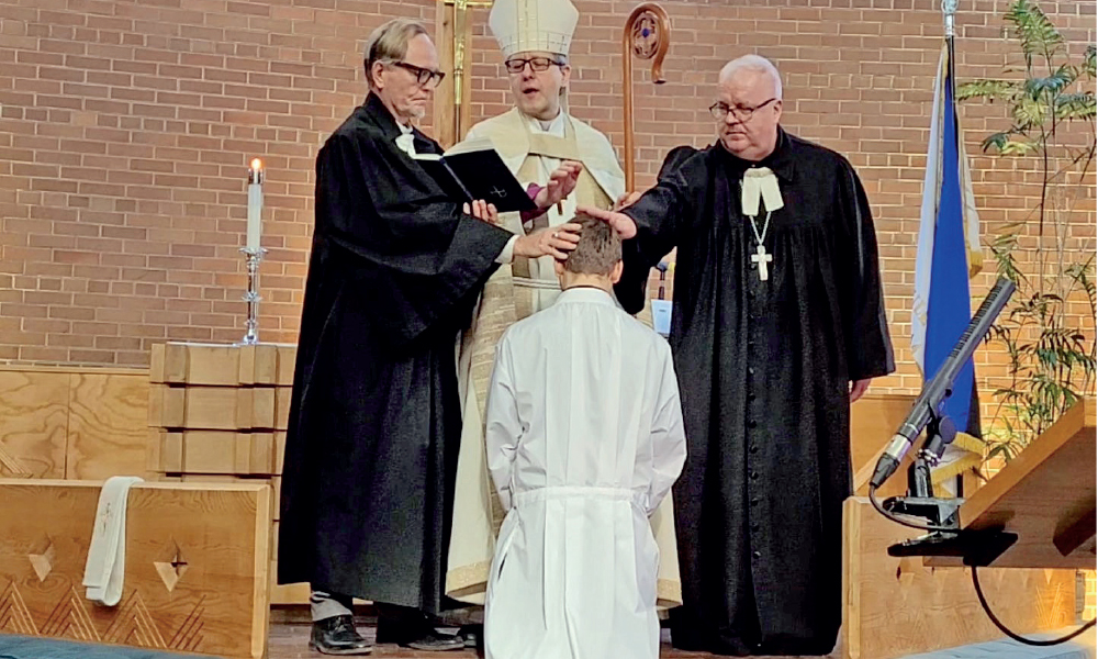 22. detsembril ordineeris ja seadis piiskop Ove Sander Toronto Peetri kirikus ametisse diakon Karl Paju. Piiskoppi assisteerisid õpetajad Kalle Kadakas (paremal) ja Ando Kass. Foto: Peeter Põldre