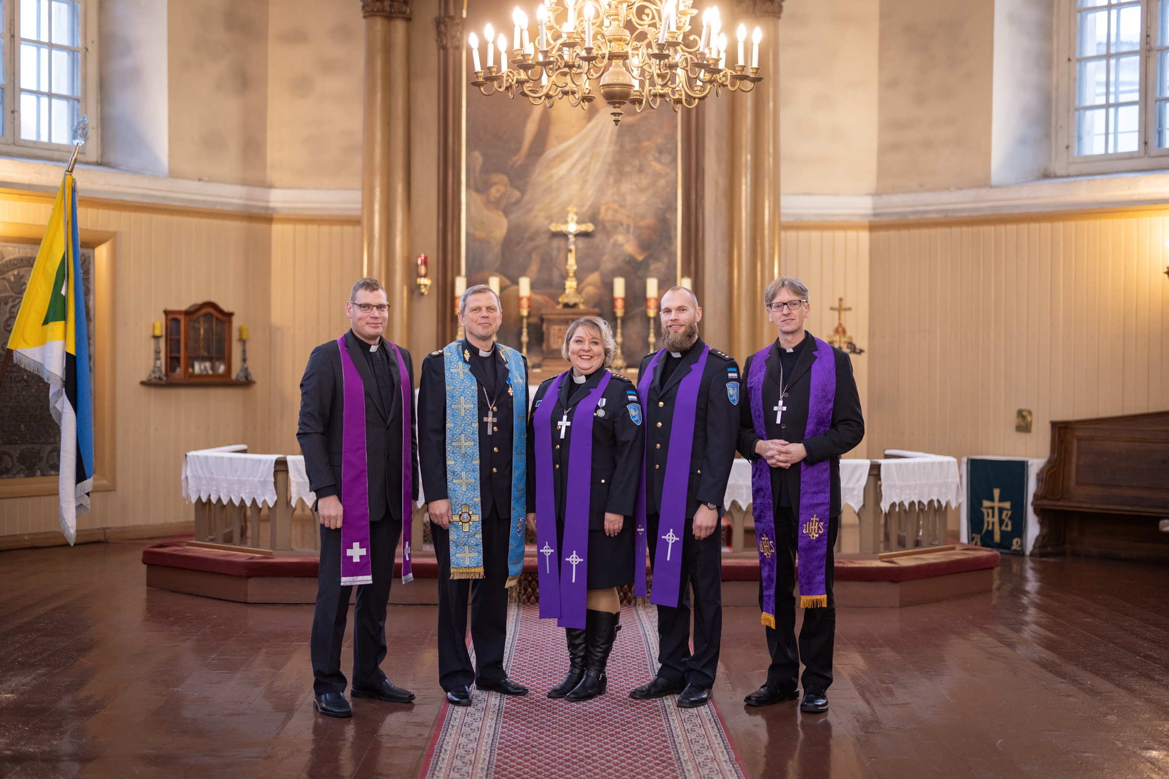Pärnu Eliisabeti kiriku altari ees on (vasakult) PPA abikaplan Arvi Tael, peakaplan Valdo Lust, kaplan Tuuli Raamat, kaplan Priidu Ellam ning pastor loci ja ka abikaplan Toomas Nigola. Foto: Reelika Riimand