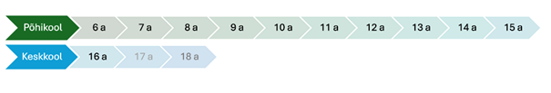 Haridussüsteem Taanis. Eurydice (2023) andmetel. Mustas kirjas kohustuslik kooliiga