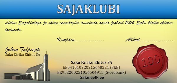 Aga samuti liituma pühendumiskampaaniaga ehk Saja- ja Viiesajaklubiga! Kampaania eesmärgiks on julgustada inimesi annetama aasta jooksul 100 või 500 eurot kiriku ehituse heaks. Pühendumislepingu saab koguduse kodulehelt www.eelk.ee/saku ise välja printida ja allkirjastada ning selle võib panna kodus nähtavale kohale, nt külmkapile. Blankette saab ka Saku palvemajast.