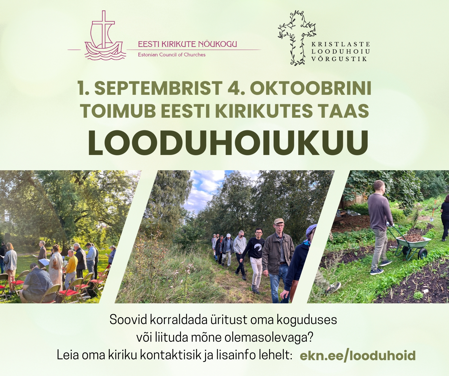 Soovid üritust korraldada või ennast juba toimuva sündmuse juurde vabatahtlikuks pakkuda? Kõigile, kes soovivad lisainfot või end vabatahtlikuks pakkuda, soovitatakse ühendust võtta oma kiriku esindajaga EKNi looduhoiu töögrupis või EKNiga.