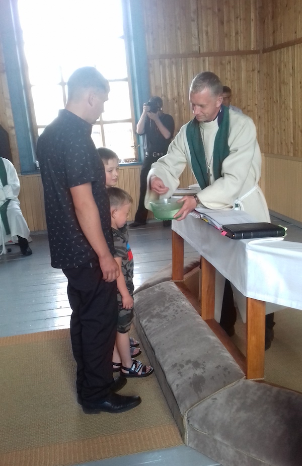 Kirikus oli ka pidulik ristimistalitus, mis näitab luterlike juurte tugevust. Sel päeval ristiti 22 inimest. Kuna küla on suures osas kakskeelne, siis andsime piiskop Kuukauppiga inimestele valida, mis keeles laps ristitakse. Piiskop ristis vene keeles 10 inimest, mina eesti keeles 12 inimest.