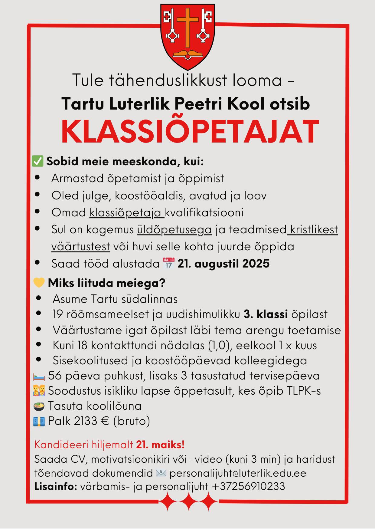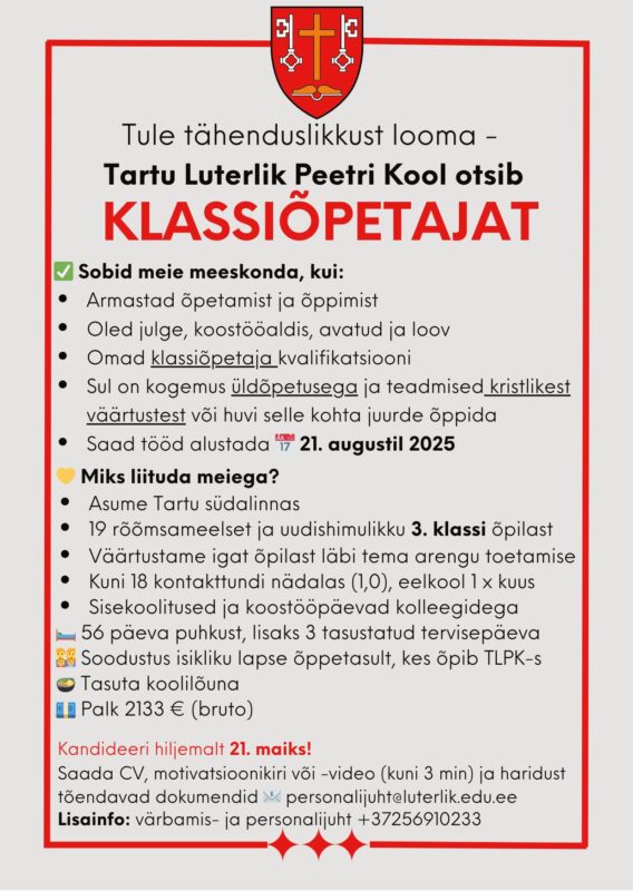Tartu Luterlik Peetri Kool otsib klassiõpetajat