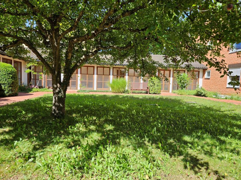 Pullachi koolituskeskuse siseõu, mille keskel kasvab suur meeldivat varju pakkuv õunapuu. Foto: Urmas Karileet