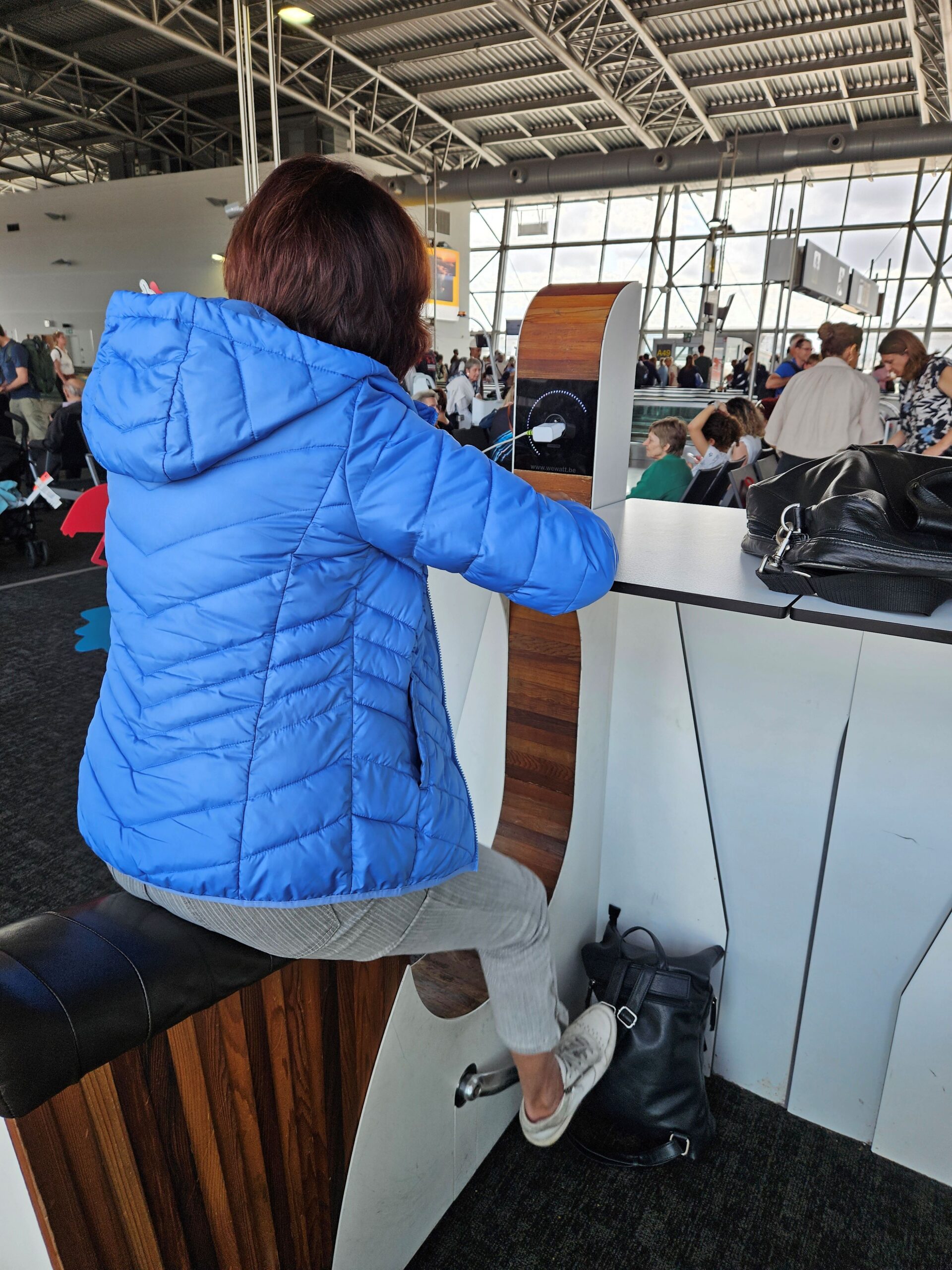 Brüsseli lennujaamas on innovatiivne mobiililaadija, mis töötab ja annab voolu pedaale sõtkudes. Selline generaatorist lisaseade võiks olla igal velotrenažööril ja veloergomeetril ka igas jõusaalis või kodus, kus selliseid seadmeid kasutatakse. Fotol laadib Riina Trankmann vändates oma mobiiltelefoni. Foto: Urmas Karileet