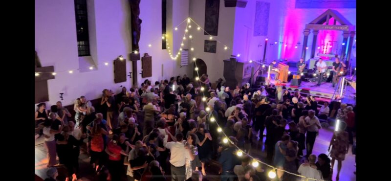Foto ühest Müncheni kirikust, kus hoone algset funktsiooni on avardatud. Kirikusaalis on eemaldatavad pingid, saali kasutatakse ka konverentsisaalina või söögisaalina. Pildil on tantsuõhtu. Foto: Urmas Karileet